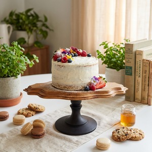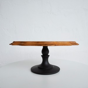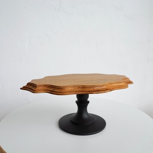クラシックなフォルムに仕上げたチーク無垢材のプレートと、ブラックベースを組み合わせたケーキスタンドです。木目の美しさと重厚感ある黒のコントラストが際立ち、テーブルを上質に演出します。削り出しで生まれる立体的なディテールは、単なる器としてだけでなく、オブジェのような存在感を放ちます。