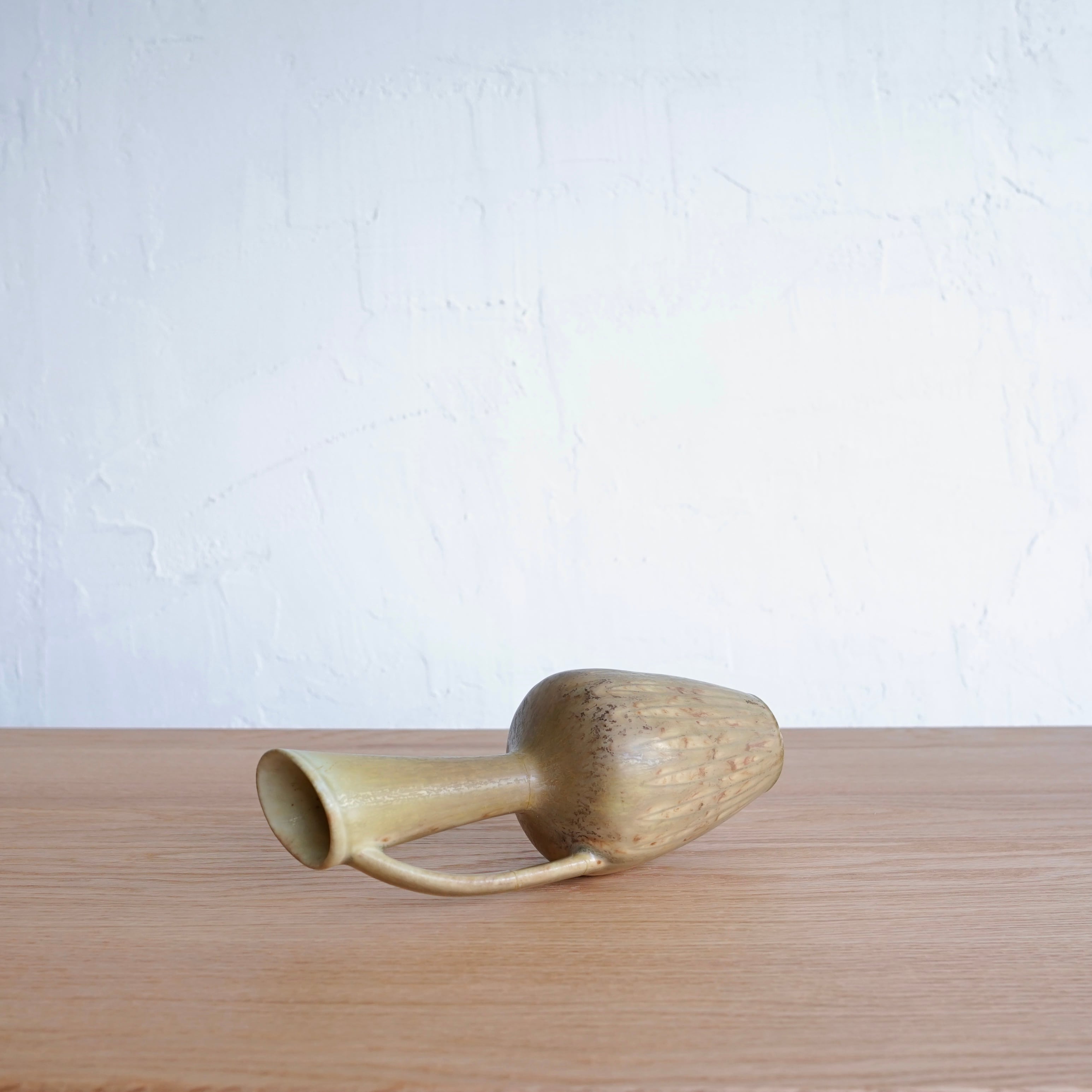 細く立ち上がるネックと縦のリブを施した胴体、片側に配されたハンドル。