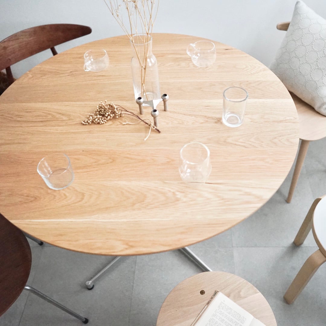 直径100cmは大きすぎず小さすぎずダイニングテーブルとしては、ほどよくミニマルなサイズ感で、3〜4人くらいがちょうど良い広さです。